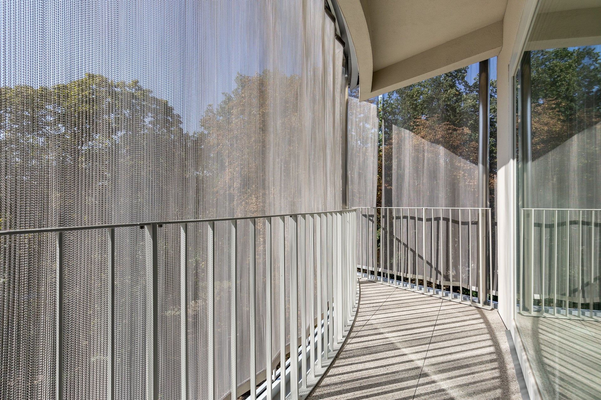 This contemporary apartment building features Wovenpanel’s flexible mesh curtains as a defining element of the façade. The slender, vertically mounted panels follow the building’s curved balconies, creating a continuous rhythm that softens the architecture while emphasizing its sculpted form.