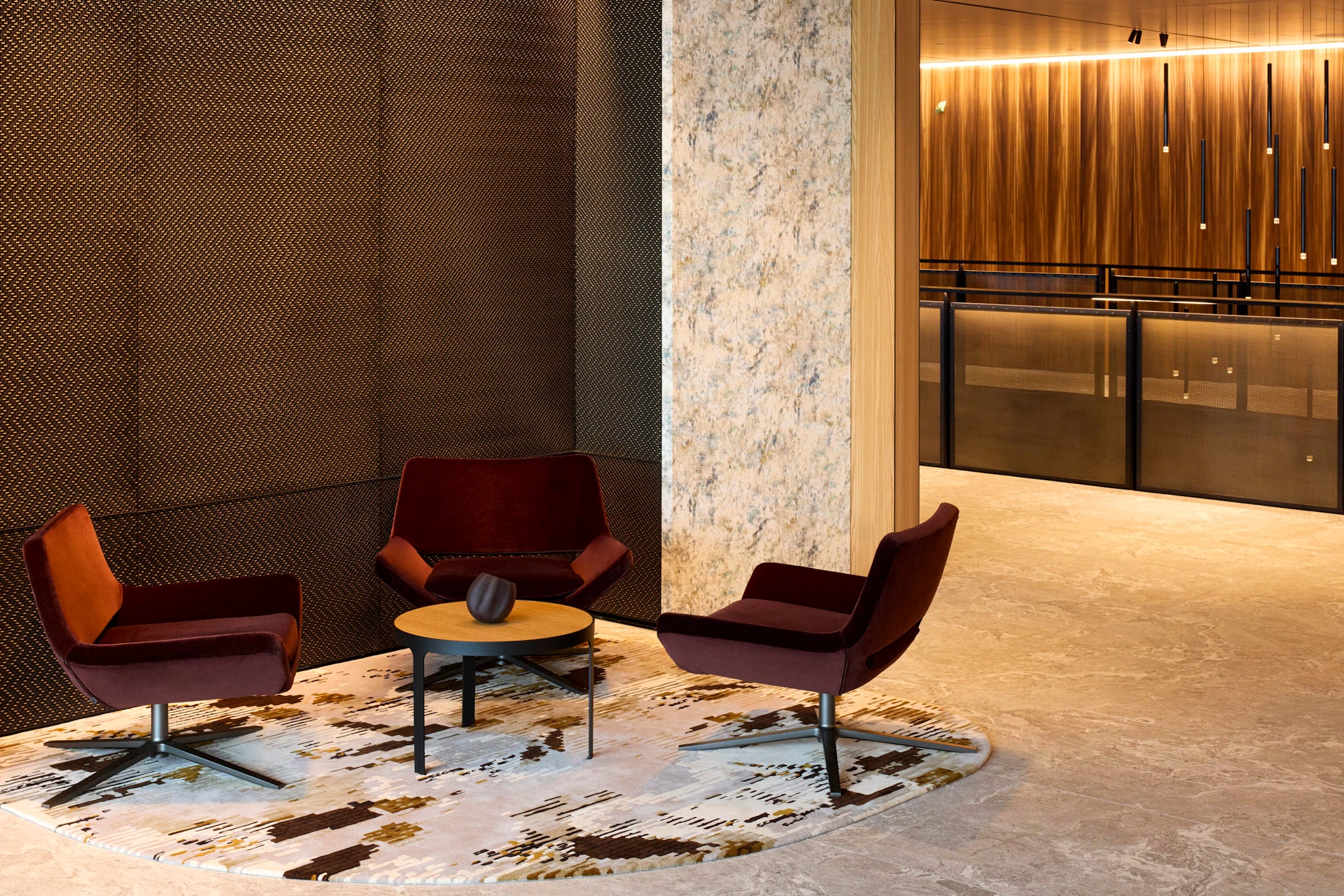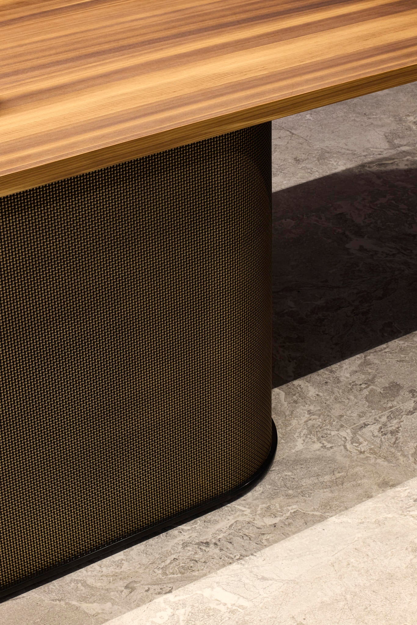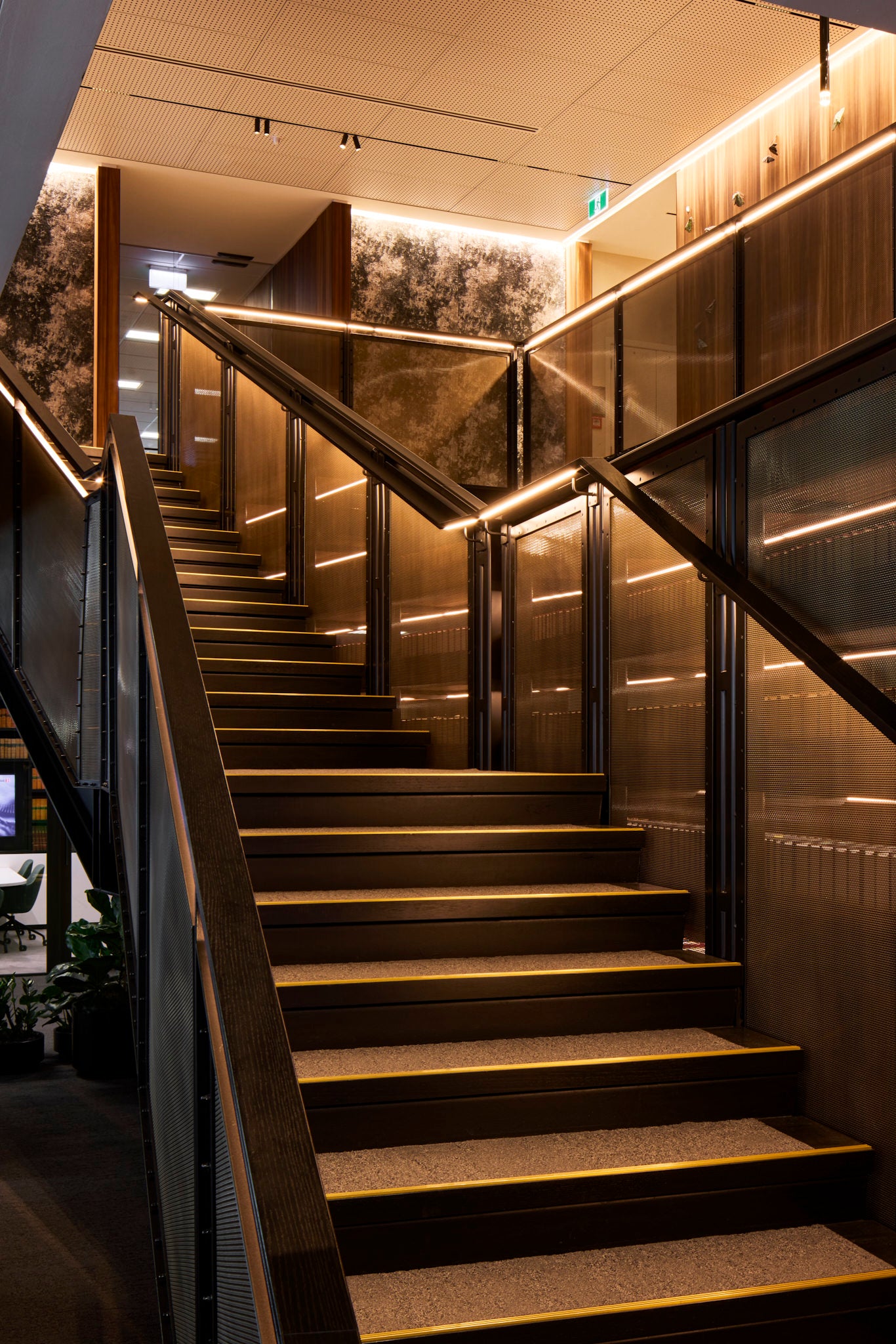 Two distinct styles of Wovenpanel® were used, Chadwell Antique Brass, and Staten Antique Brass. This included gorgeous and functional stair balustrading, feature wall applications, curved reception counter enhancement, and ornate backing for the library shelving. The result is an understated but functional showcase of sophistication. The common areas are infused with personality while enhancing the overall flow of the collaborative spaces.